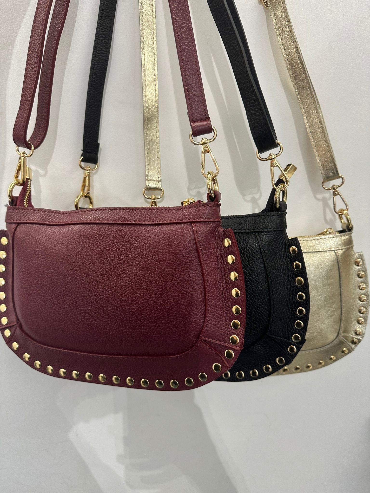 bolso de piel con tachuelas, bolso pequeño piel mujer, bolso bandolera piel, bolso burdeos piel, bolso negro piel, bolso dorado piel, bolso elegante Luxala Shop, bolso cruzado con tachuelas.