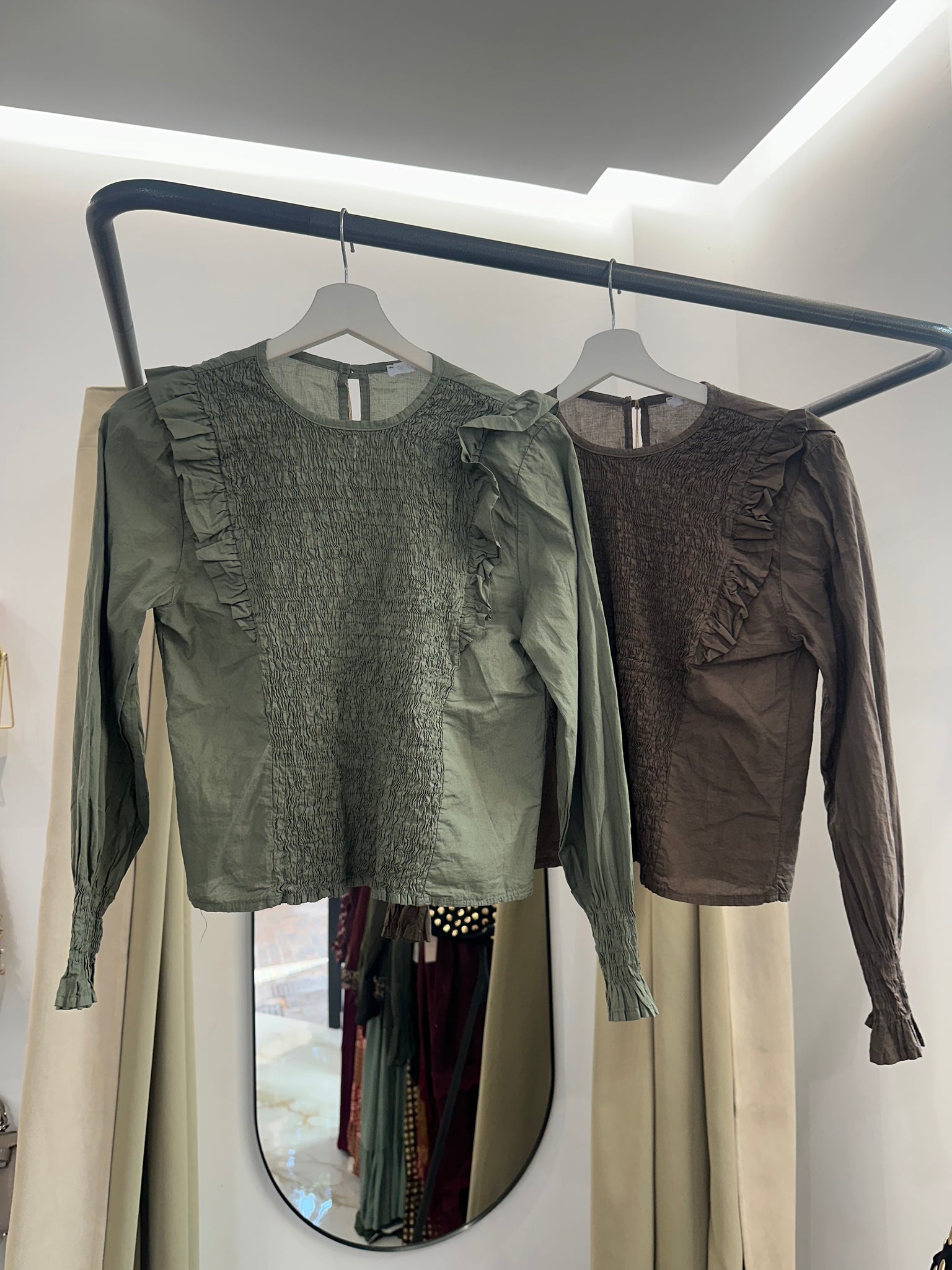blusa fruncida mujer, blusa con volantes, blusa verde elegante, blusa marrón de algodón, blusa romántica Luxala Shop, blusa manga larga, blusa femenina otoño.