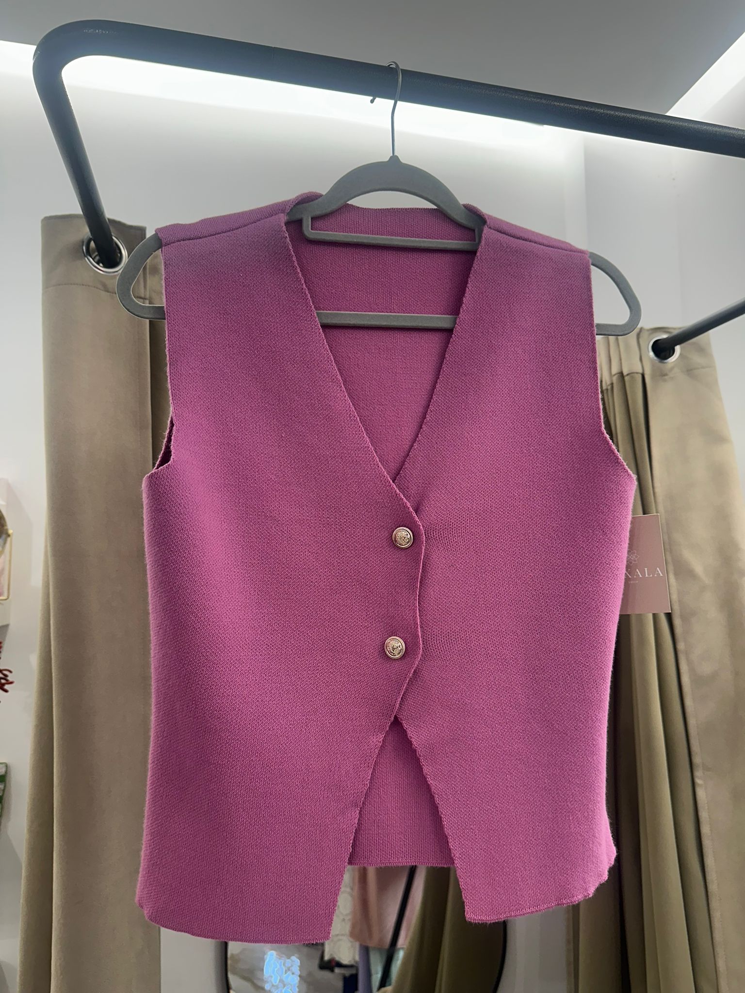 Chaleco de punto rosa fucsia con botones dorados – Estilo chic y versátil