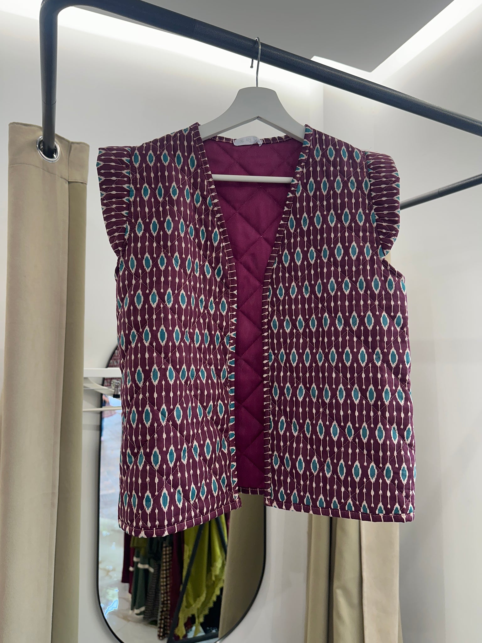 Dale un toque chic y moderno a tus looks con este chaleco acolchado estampado, disponible en dos tonos versátiles: burdeos y azul. Confeccionado en tejido ligero pero estructurado, es ideal para llevar como prenda de entretiempo o para superponer en outfits de otoño e invierno.