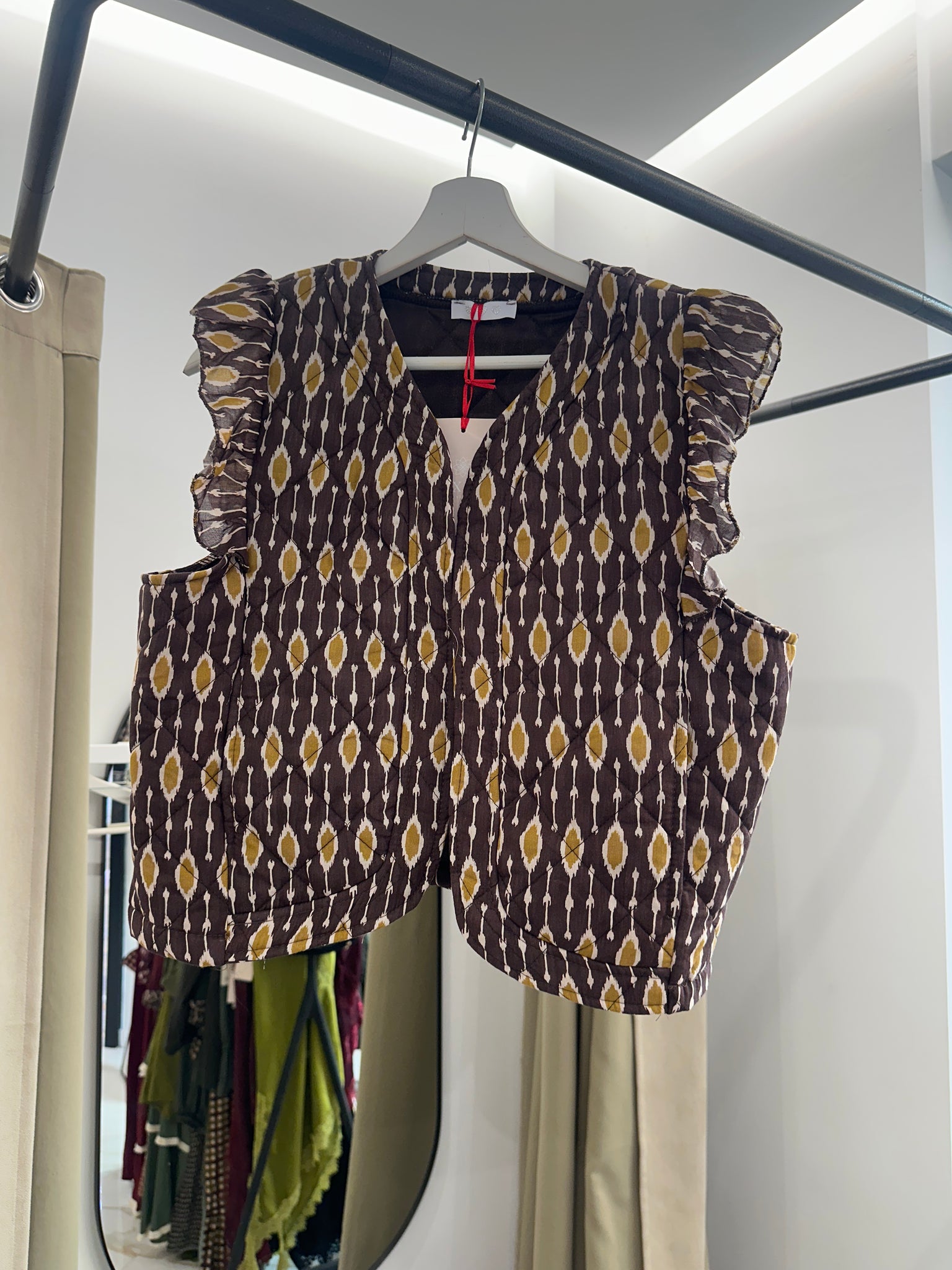 chaleco acolchado mujer, chaleco estampado boho, chaleco con volantes, chaleco ligero Luxala Shop, chaleco burdeos, chaleco marrón mostaza, chaleco entretiempo mujer, chaleco tendencia otoño.