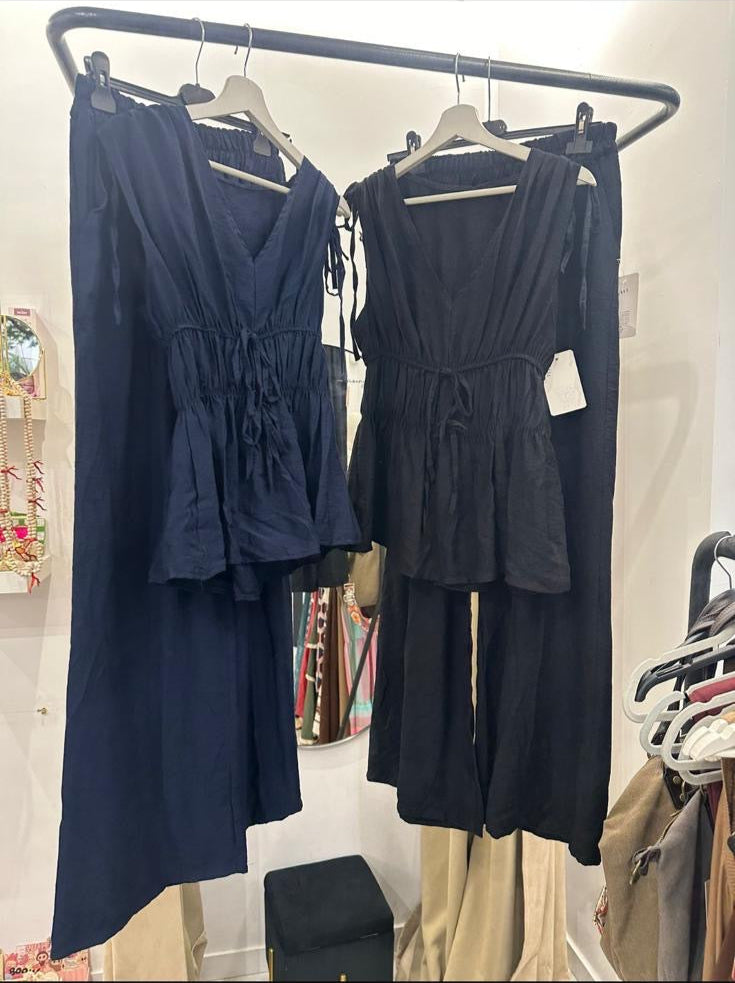conjunto top y pantalón mujer, conjunto fluido verano, conjunto dos piezas talla única, conjunto azul marino mujer, conjunto negro elegante, conjunto casual chic, ropa cómoda verano.