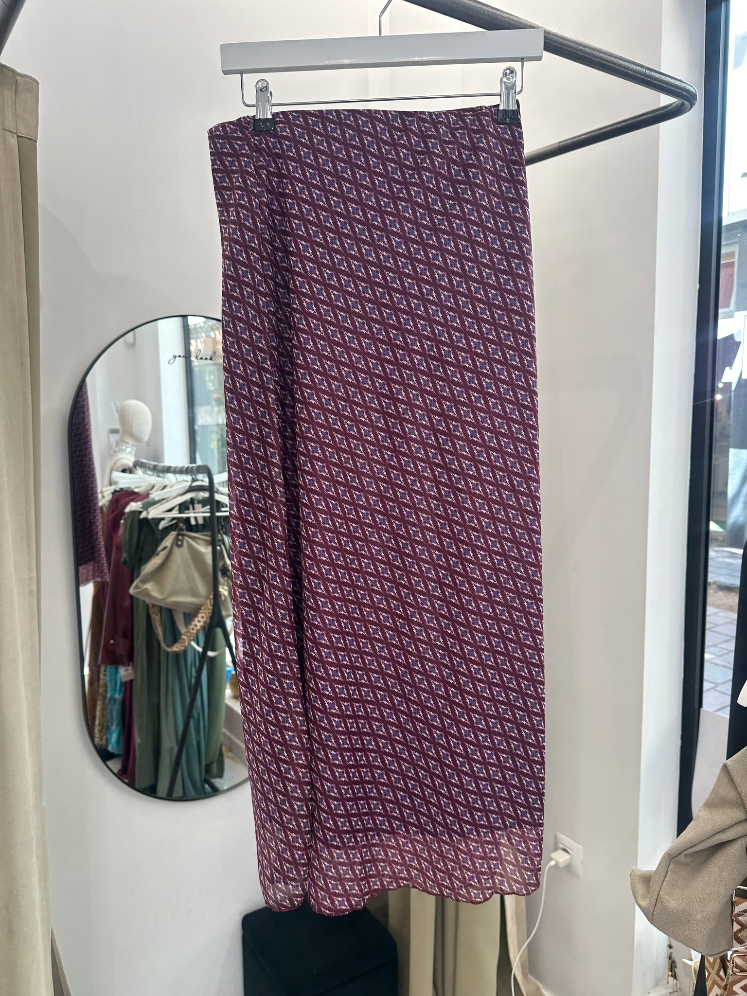 Luce estilo y comodidad con esta falda midi estampada, diseñada en un tejido ligero y vaporoso que aporta movimiento y frescura. Su estampado geométrico en tonos burdeos y blanco le da un aire moderno y versátil, ideal para combinar tanto en looks de día como de noche.