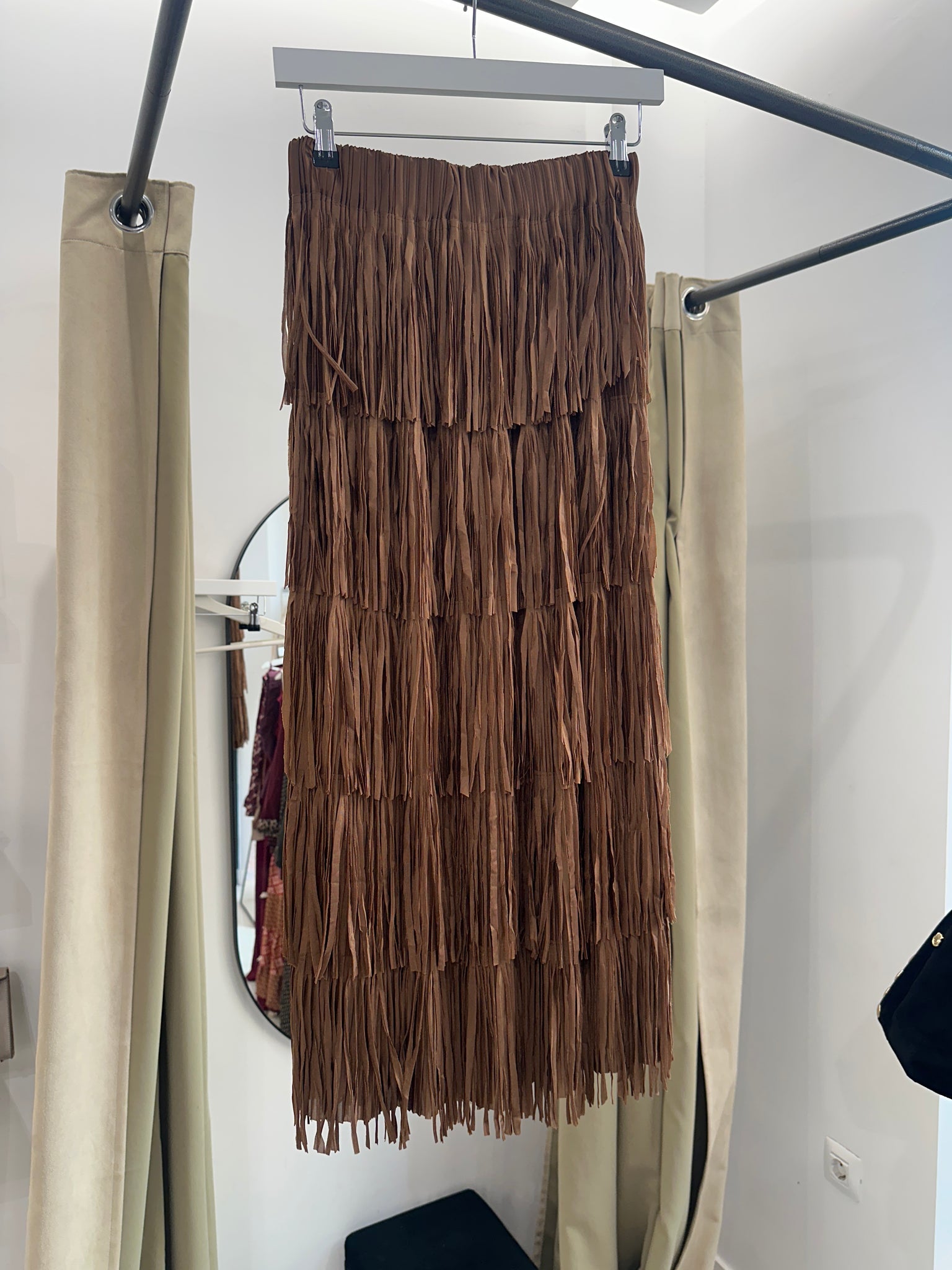 La falda con flecos es una prenda icónica que eleva cualquier look con su estilo boho-chic y movimiento elegante. Su diseño de capas con flecos largos aporta dinamismo y personalidad, perfecta para destacar tanto en outfits de día como de noche.