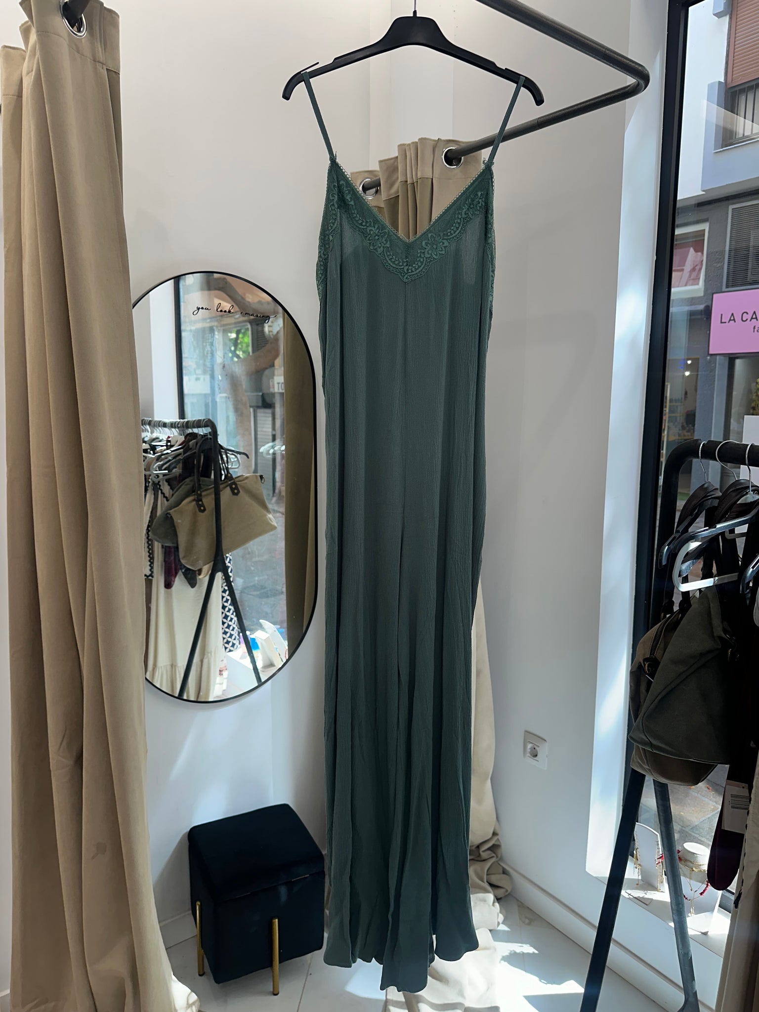 Aporta elegancia y frescura a tus looks con este mono largo de estilo lencero. Confeccionado en tejido ligero de caída fluida, cuenta con finos tirantes regulables y un delicado detalle de encaje en el escote en V. Su tono verde profundo lo convierte en una prenda versátil, ideal tanto para un look casual con sandalias planas como para una ocasión especial con tacones y accesorios.