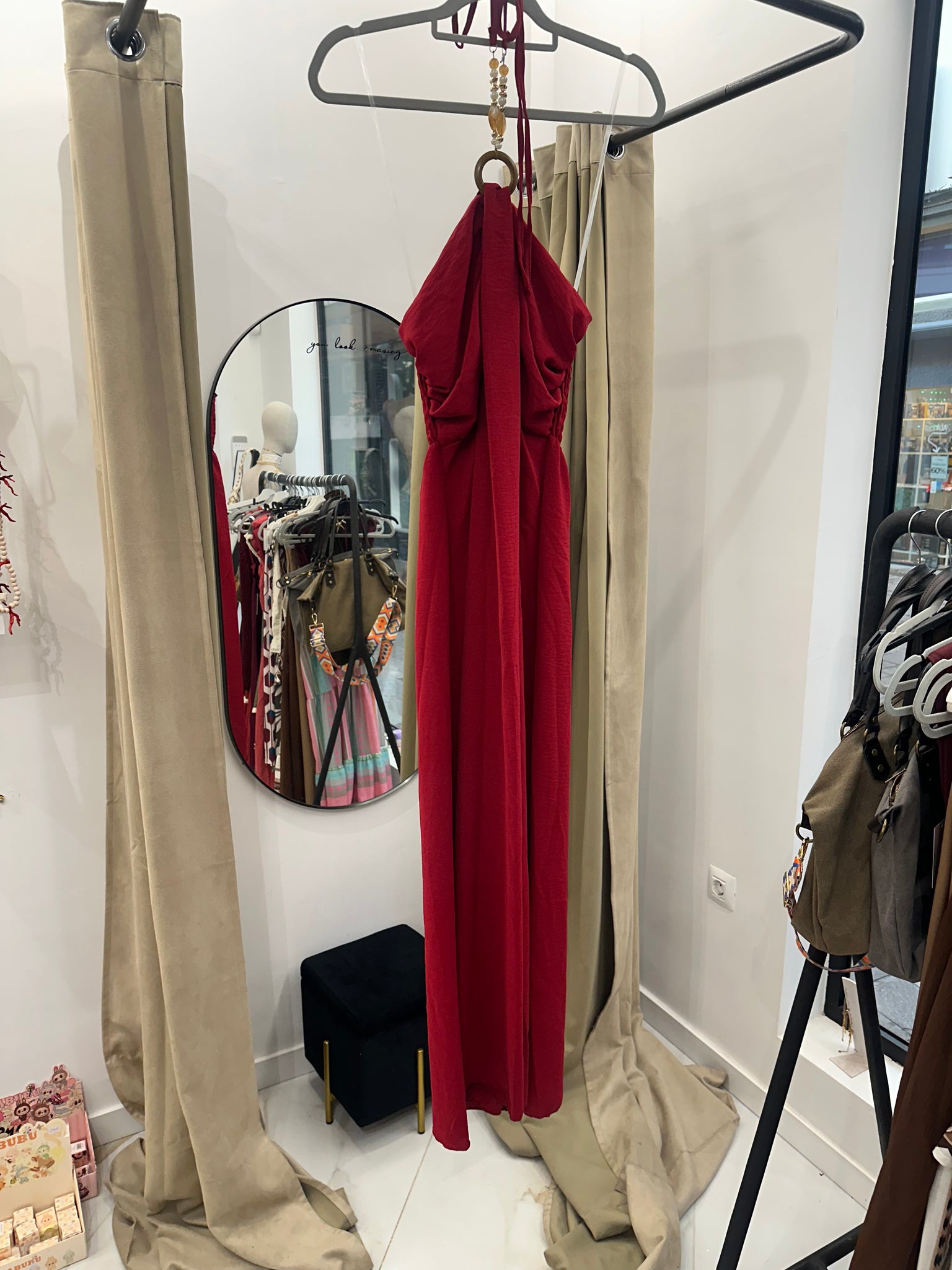 Este vestido largo de diseño halter es pura sofisticación boho. Confeccionado en tejido ligero y fluido, cuenta con un elegante escote en V sujeto por un aro decorativo en el centro, del que nace un delicado tirante adornado con cuentas de madera y abalorios. Su silueta suelta y vaporosa estiliza la figura y lo hace cómodo para llevar durante todo el día. Disponible en rojo intenso y teja, es perfecto tanto para un evento especial como para una cena veraniega.
