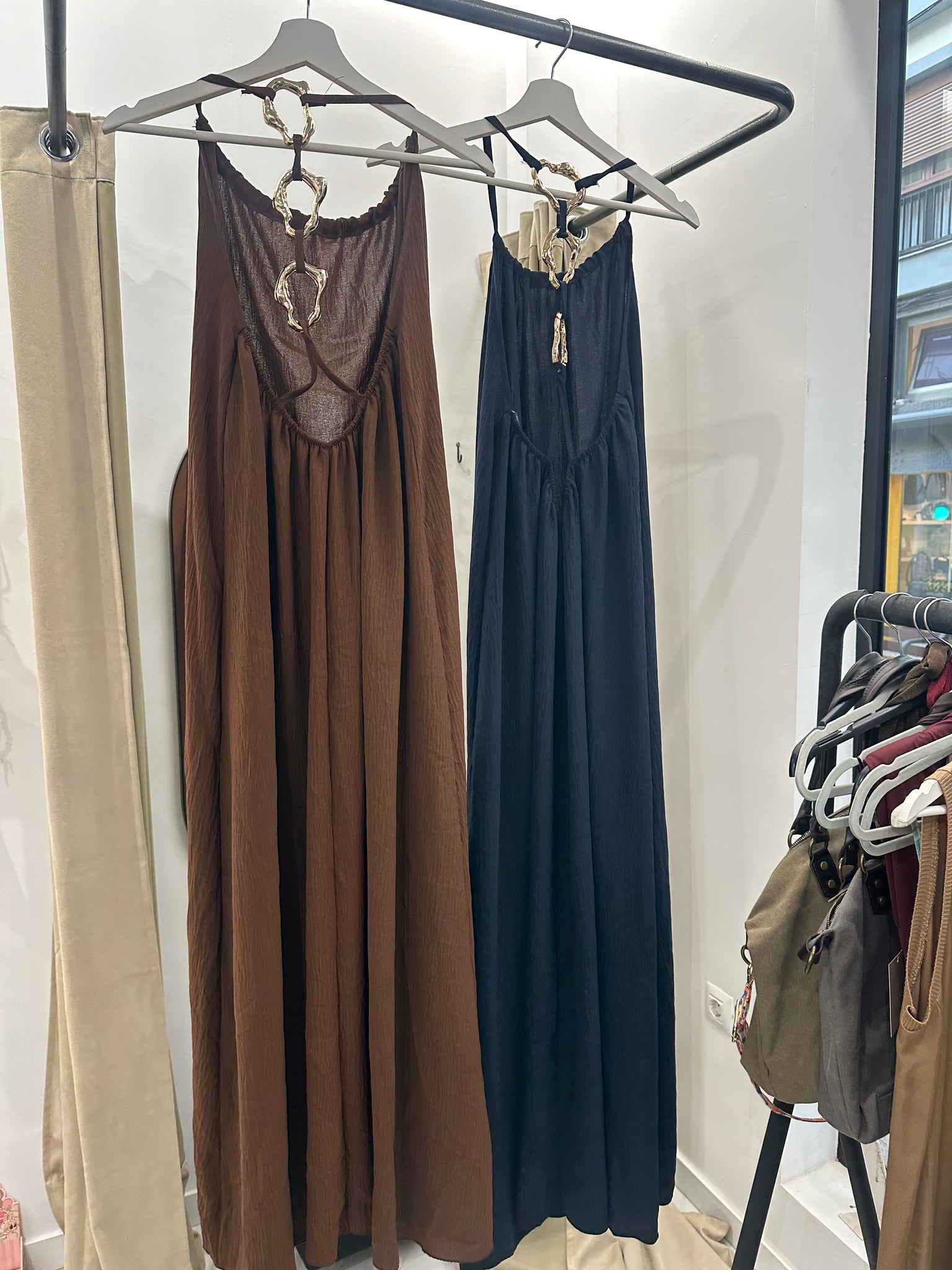 Este vestido largo es la definición de elegancia relajada. Confeccionado en tejido ligero y fluido, presenta un favorecedor escote en la espalda adornado con un original detalle de aro que le aporta un toque sofisticado y bohemio. Disponible en dos colores atemporales —marrón tierra y azul noche—, su caída amplia y cómoda lo convierte en la elección perfecta para días cálidos o noches especiales. Ideal para combinar con sandalias planas o cuñas.