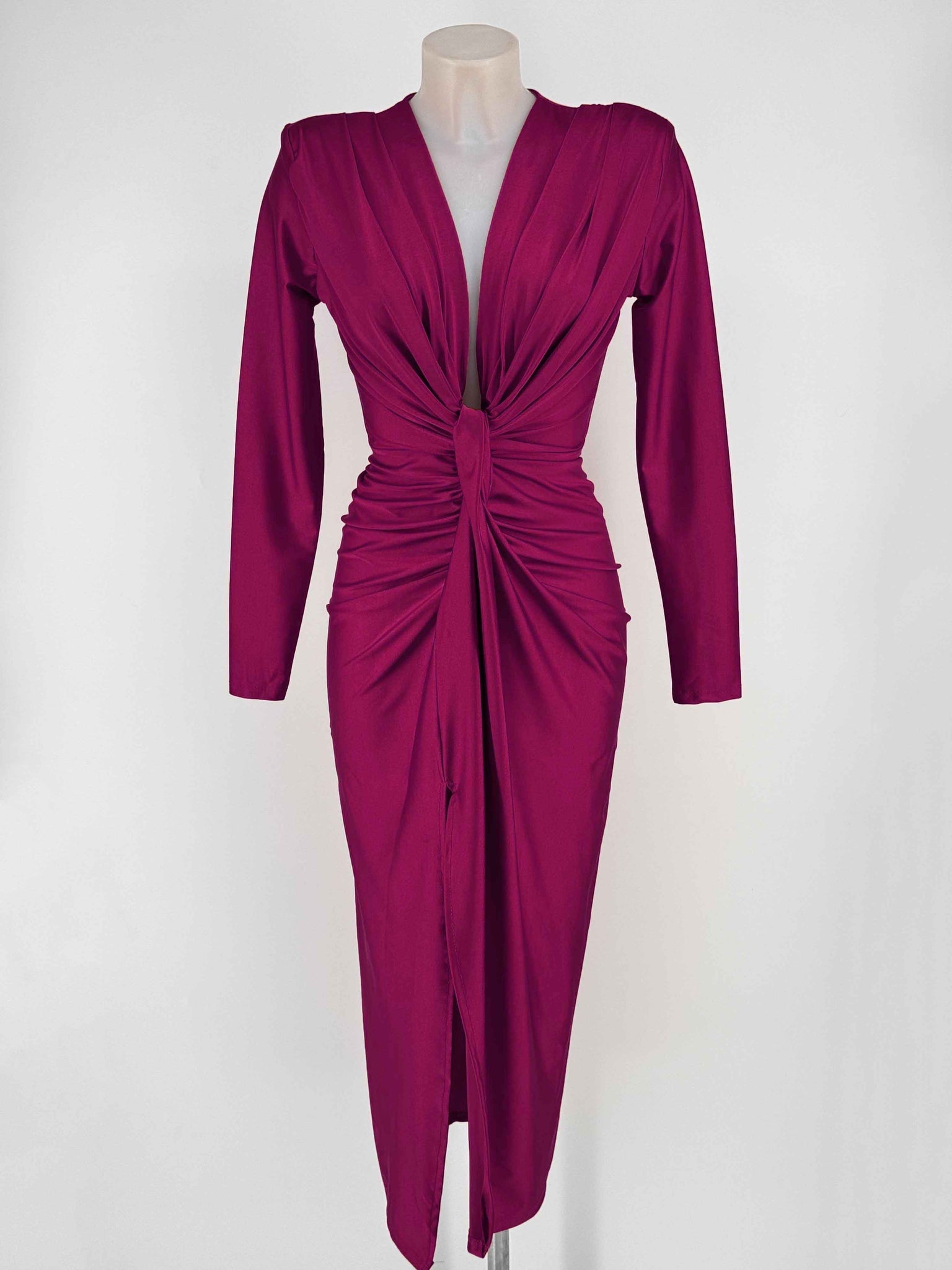 Impactante, elegante y con un toque de glamour. Este vestido largo buganvilla destaca por su escote profundo cruzado y su diseño drapeado en la cintura, que estiliza la figura y realza las curvas de forma natural. Confeccionado en un tejido fluido con caída impecable, es ideal para eventos, bodas o noches especiales.