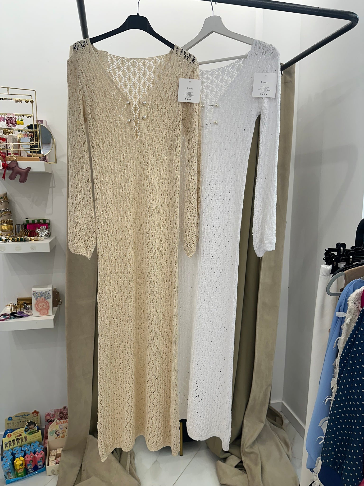 Ideal para los días de sol y los planes junto al mar. Este vestido largo calado en tono beige es una prenda ligera, versátil y muy chic. Su diseño en punto abierto deja entrever lo justo, siendo perfecto como vestido de playa o para lucir con un conjunto interior bonito. Tiene escote en pico, botones decorativos y manga larga, aportando un aire boho y sofisticado.