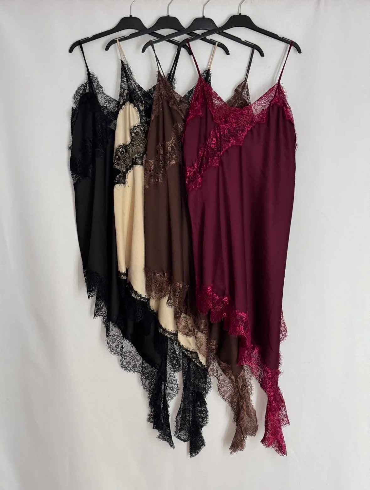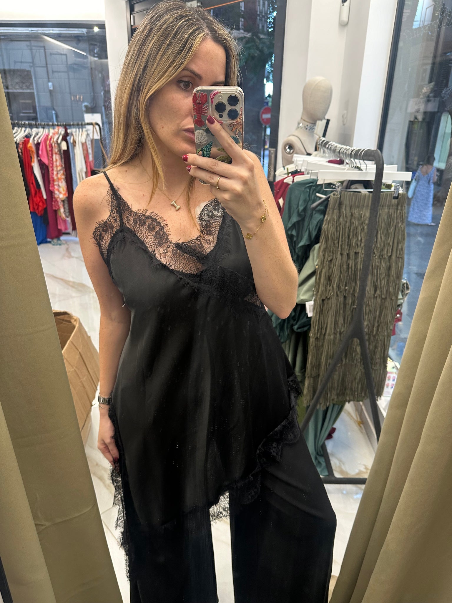 Sutil, femenino y con un toque de sofisticación. Este top lencero negro combina un diseño asimétrico con delicados detalles de encaje que realzan el escote y el bajo. Su tejido fluido y ligero lo convierte en una prenda versátil, ideal tanto para looks de noche como para un estilo más casual con un toque chic.