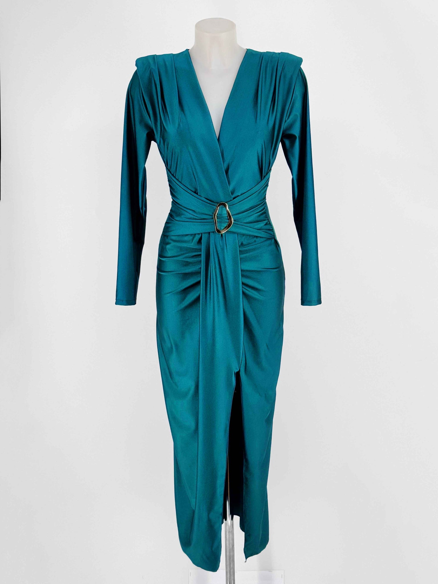 El diseño cruzado con escote en “V” realza el pecho de forma favorecedora, mientras el frunce central estiliza la figura y el cinturón dorado marca la cintura con elegancia. La abertura frontal añade un toque sensual sin perder la clase.